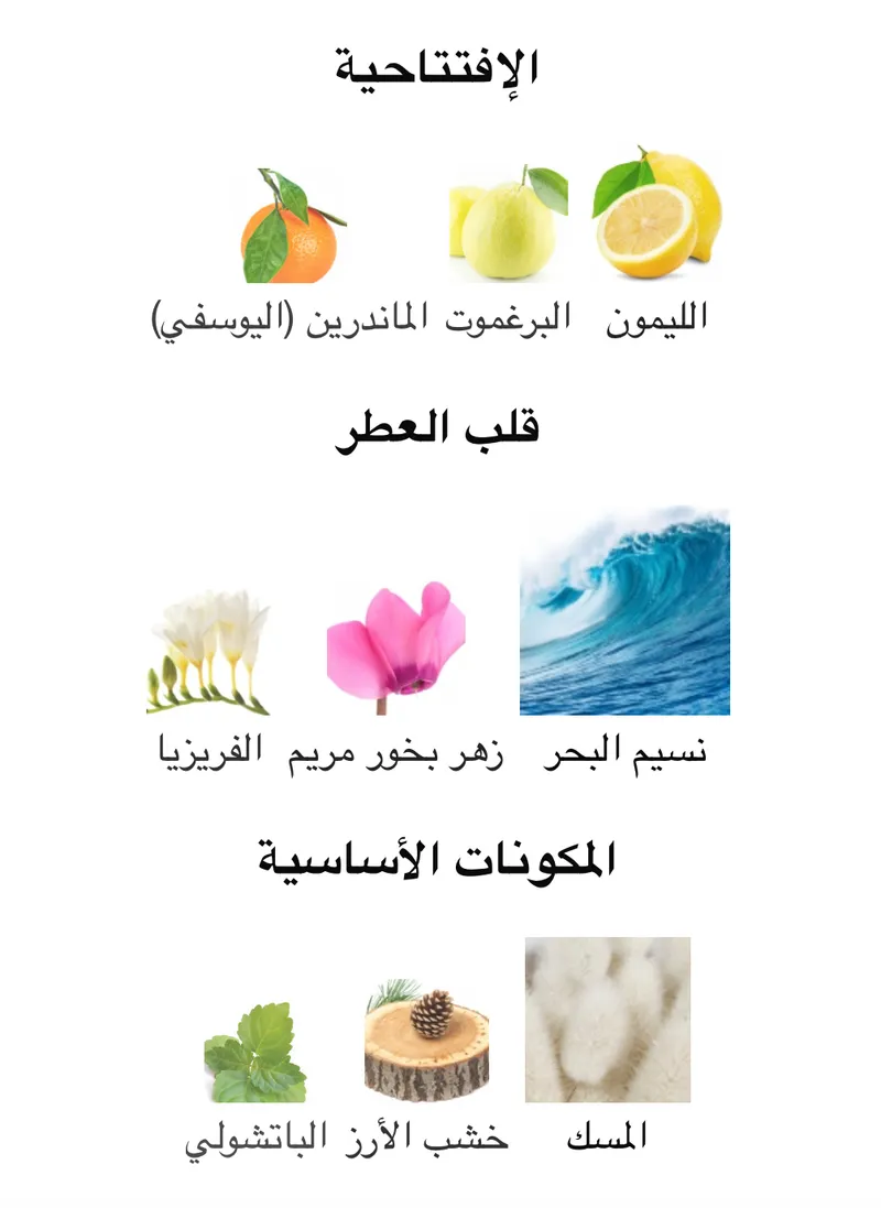 تبدأ التركيبة بنفحات مشرقة ومنعشة من البرغموت والليمون، مما يمنح إحساسًا بالنقاء والحيوية. تمتزج هذه النفحات مع لمسة فاكهية خفيفة تضفي طابعًا عصريًا.